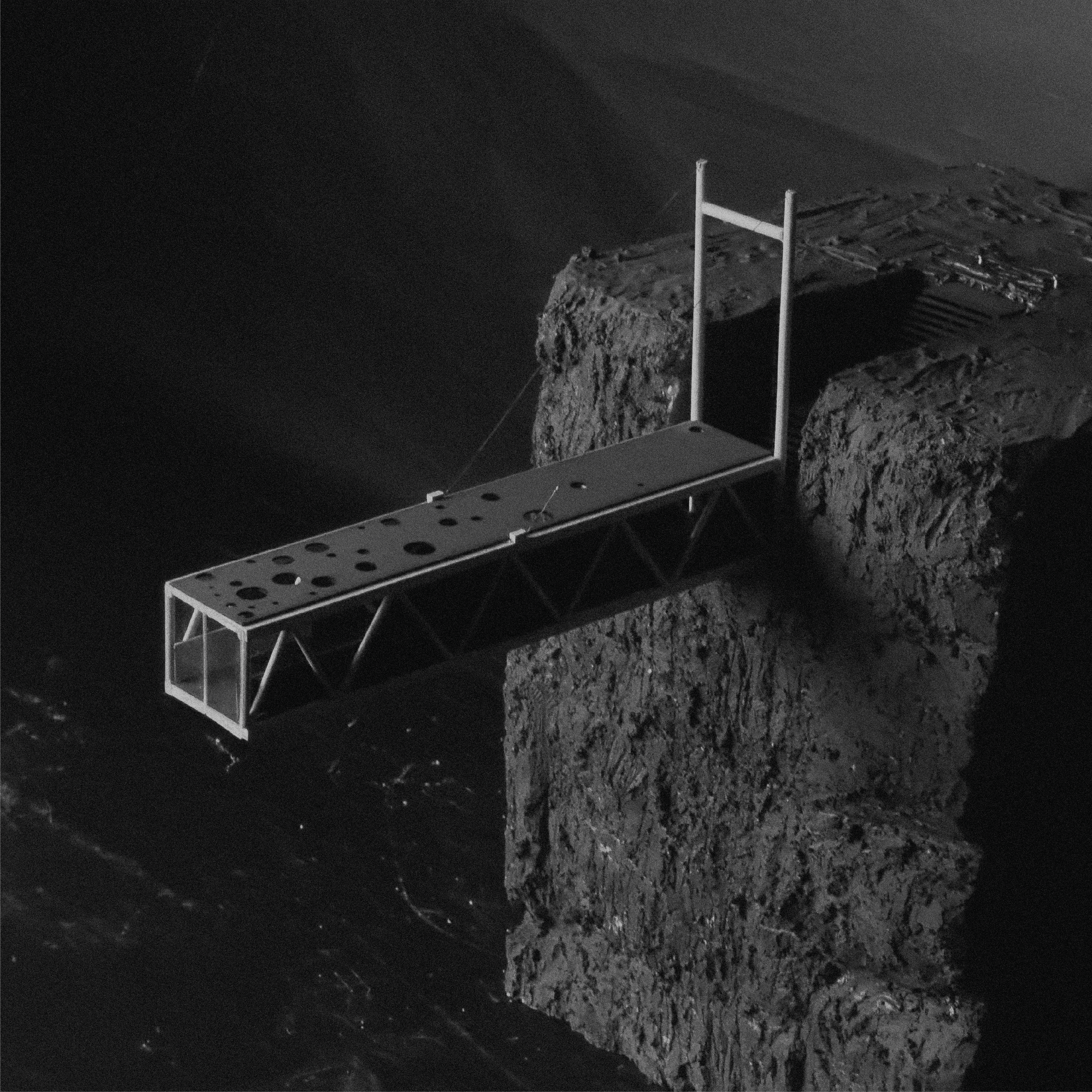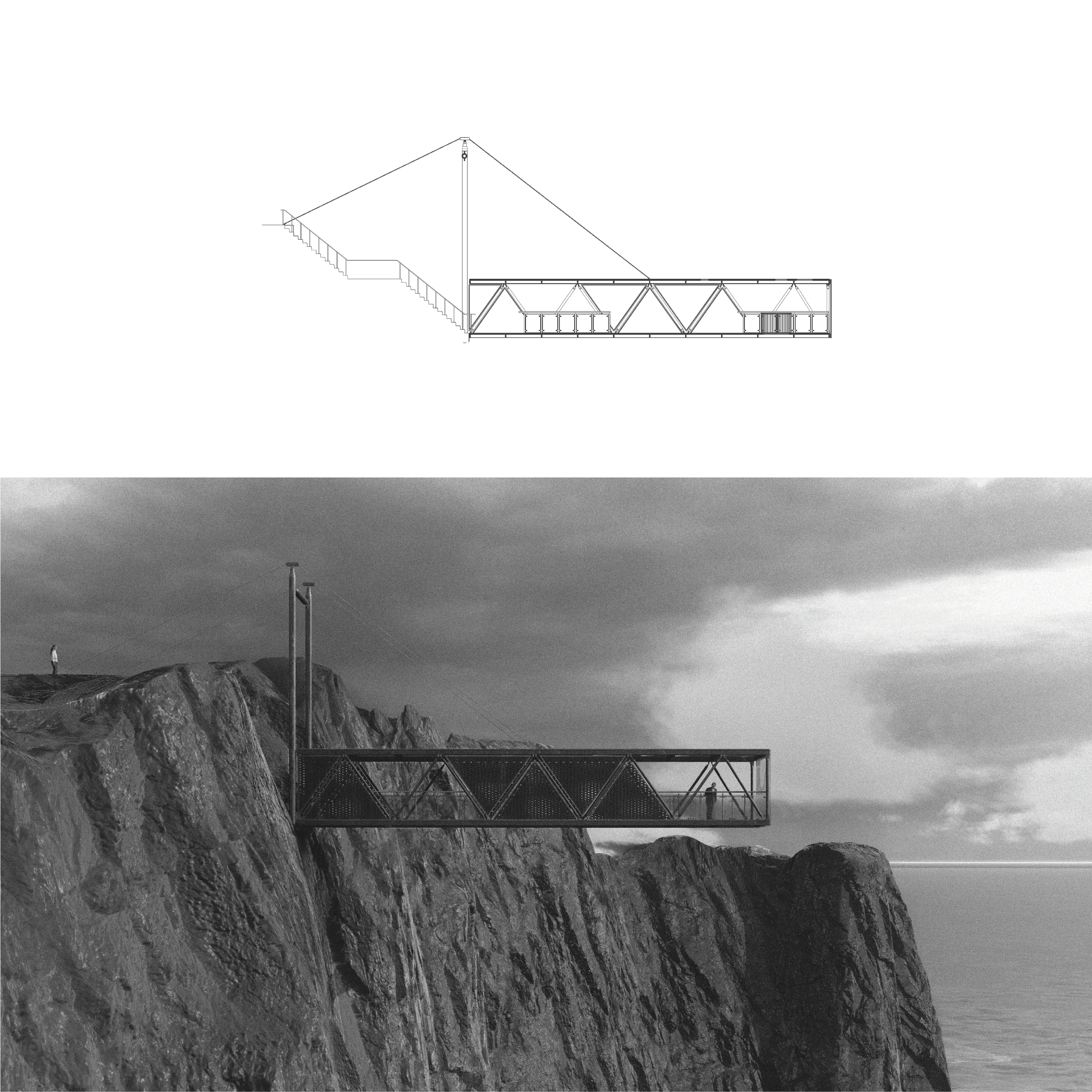 Équilibre structurel | En contrebas, entre falaise et mer, la structure flottante se déploie comme un prolongement fragile de la roche. Perchée dans le vide, Cliffborn révèle sa légèreté structurelle, défiant la gravité tout en suspendant le regard entre pierre, eau et horizon. La finesse de ses lignes et l’équilibre précis de ses éléments accentuent la tension entre robustesse et vertige.