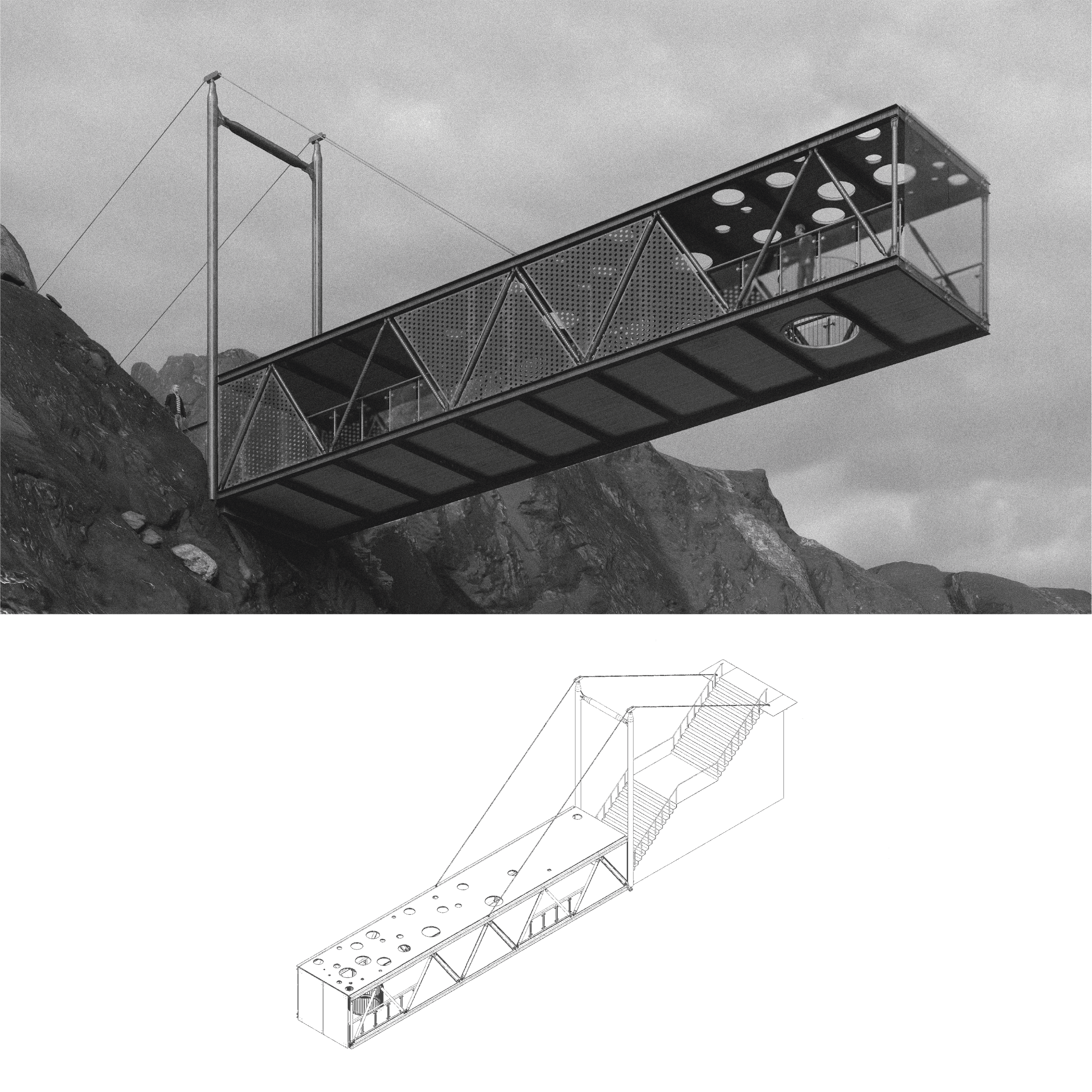 Située en limite littorale, Cliffborn : Observation Nest Between Sky and Water, structure flottante, agit comme un observatoire suspendu entre deux éléments : l'eau et le ciel. Pensée comme un seuil poétique entre le monde terrestre et l'horizon marin, elle propose une expérience sensible du paysage, tout en reposant sur une rigueur structurelle affirmée. En approche du point d'observation, la structure cadre l'horizon et agit comme un amplificateur du paysage. Elle guide le visiteur à travers une séquence descendante, un escalier intégré qui connecte le regard et le corps au site. Ce passage crée un lien physique entre la plateforme flottante et le sol naturel, faisant émerger une tension entre légèreté aérienne et matérialité brute. Sous un couvert perforé, la lumière naturelle est filtrée en jeux d’ombres mouvants. Les perforations, réparties selon une trame subtile, réduisent visuellement la masse de la toiture tout en ouvrant l’espace à l’imaginaire. Cette fragmentation de la lumière crée un espace propice à la rêverie, à la créativité et à l’ouverture du regard vers l’infini. Plus l’on avance sur la plateforme, plus la sensation de flottement s’intensifie. La légèreté structurelle devient perceptible, presque déstabilisante, à mesure que le vide s’installe sous les pieds. En fin de parcours, un vide central – une ouverture circulaire – s’impose comme une faille dans la continuité du plancher. Ce vide, en tension permanente avec l’océan en contrebas, provoque une expérience de vertige contrôlé, une plongée sensorielle dans la profondeur. Cette structure incarne une démarche architecturale où la précision technique, notamment dans les détails d’assemblage, vient soutenir une narration spatiale forte. Elle articule avec justesse rationalité structurelle et émotion, légèreté formelle et profondeur de sens.