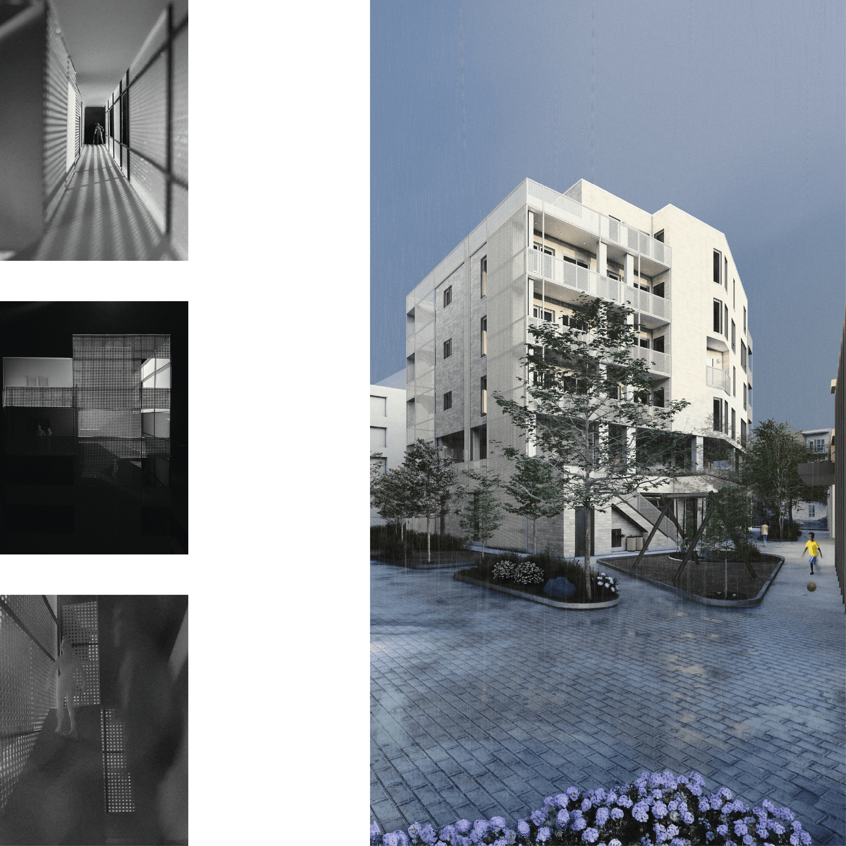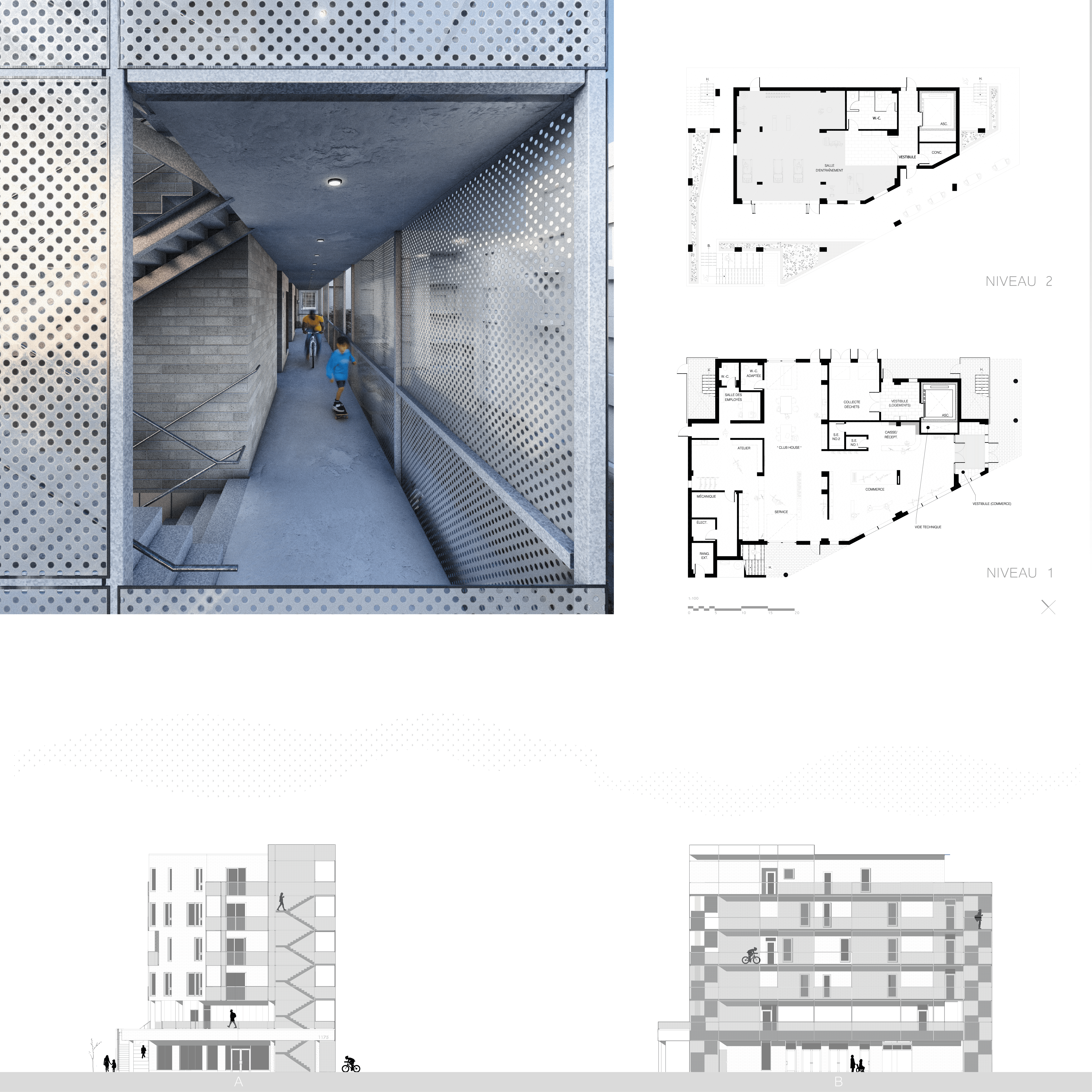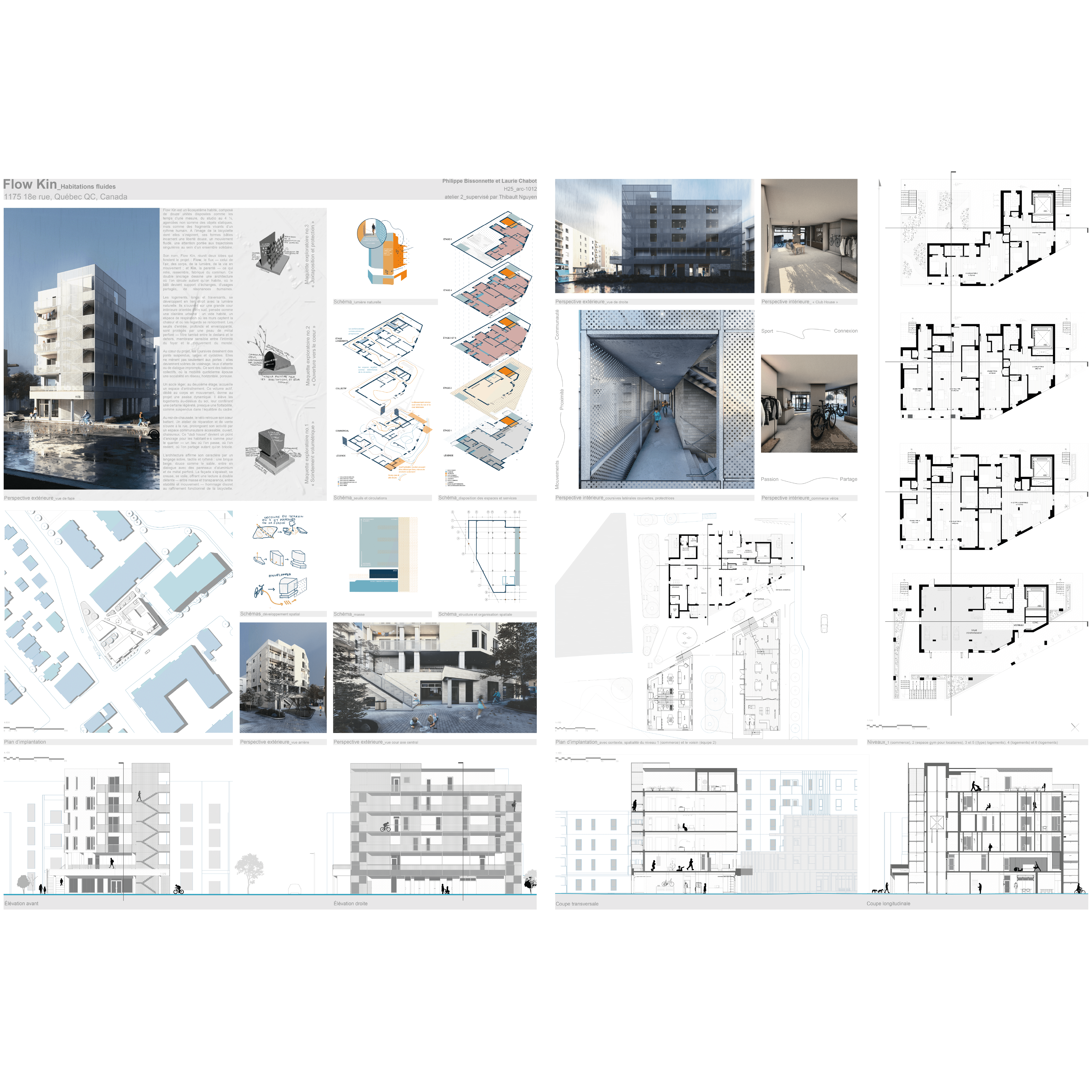 Flow Kin est un écosystème architectural où douze unités d’habitation s’articulent comme les temps d’une mesure, ni alignées, ni figées, portées par un souffle commun. Inspiré par la mécanique douce de la bicyclette, le projet explore mouvement et ancrage, entre trajectoires individuelles et solidarité spatiale. "Flow" évoque l’air, la lumière, les corps en mouvement ; "Kin", un collectif solidaire où l’on veille les un·e·s sur les autres. L’architecture dialogue entre intérieur et extérieur, où les seuils deviennent espaces de vie partagés, propices aux échanges et au voisinage. Une cour végétale orientée plein sud agit comme clairière urbaine ; les coursives prolongent les logements, accueillent le quotidien et transforment mobilité en sociabilité. Flow Kin dessine un lieu habité, léger et ancré, où chaque espace respire au rythme commun.